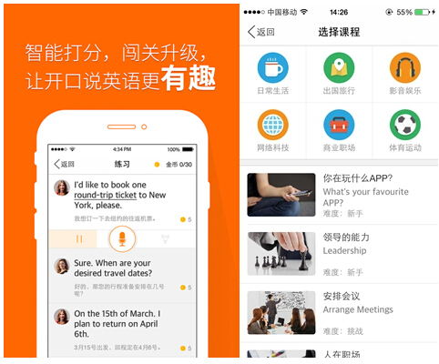 目前,“多说英语”的课程内容分为六个类别的场景,每个类别下分为许多细化的对话场景。用户练习对话时,会模仿游戏中的闯关模式,每个细化场景有五个人机对话关和一个外教关卡。