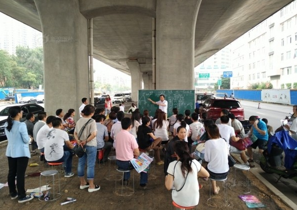 河南省郑州市一家私人培训机构在高架桥下开设小升初培训班。家长扎堆坐板凳听课。当日是郑州市兴华中学进行小升初招生考试。在学校门口外面,培训机构纷纷抓住机会宣传。