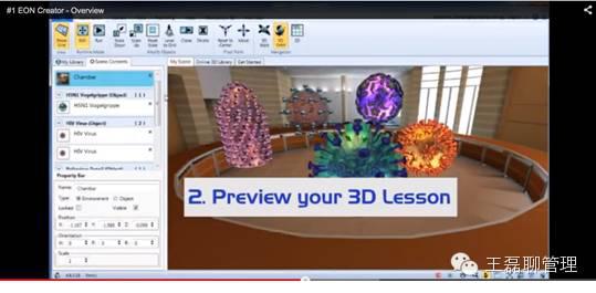 EON的3D虚拟学习把3D技术和虚拟现实(VR)结合在一起,运用到课堂中来改变传统的教育。3D虚拟课程学习可运用在解剖学、建筑学、天文学、生物学、工程学、地理学、历史、物理、化学等多个领域学科以及医学和工程的训练中。