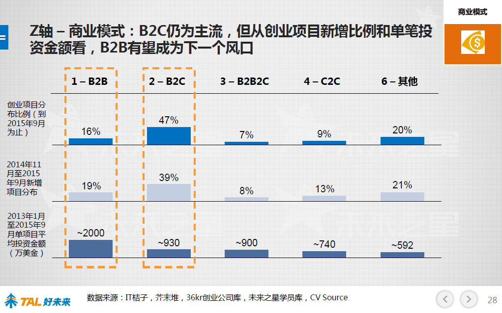 相关数据也显示,虽然B2C 现在仍是主流(截止至2015年9月,B2C项目占所有项目的47%),但从单笔投入和近一年来的新增项目比例来说, B2B开始发力。从2014年底以来的B2C类新增项目占所有新增项目的39%,单笔投资金额在930万美金;而对于B2B来说,从2014年底以来的新增项目占所有新增项目的19%,单笔金额在2000万美金,单项目投资金额远超B2C。
