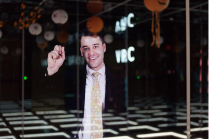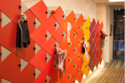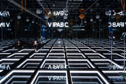 VIPABC充满科技感的来访登记区,放眼望去,似乎整个空间都被黑色方格所覆盖。探营时正值万圣节,整个公司充斥着万圣节的氛围,来访者可以轻触墙壁,虚拟接待人员会引导来访者做信息登记,并向前台接待人员办公室发出来访者信息。