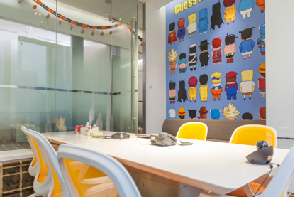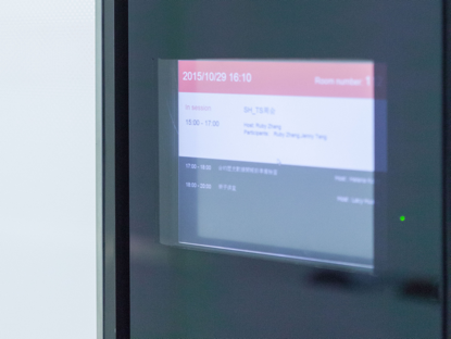 VIPABC会议室,每一间会议室以一句英文作为主题,都有不同的主题背景墙,背景墙是设计师手绘而成,希望给员工提供轻松的办公氛围。每间会议室的外部小屏幕上会显示会议室的预约信息,员工若需使用会议室,只需要通过系统预约,预约完成后,会议室前的小屏幕上会实时显示最新显示预约信息。