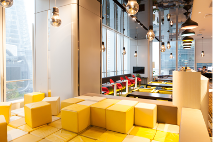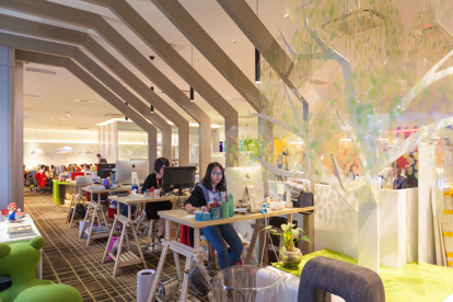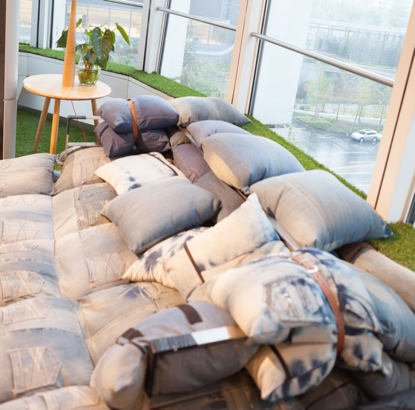 VIPABC员工休息区,最近的这个区域可以供员工休息放松,远处的桌子可以用来开小型会议或者讨论(如下图)。