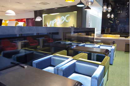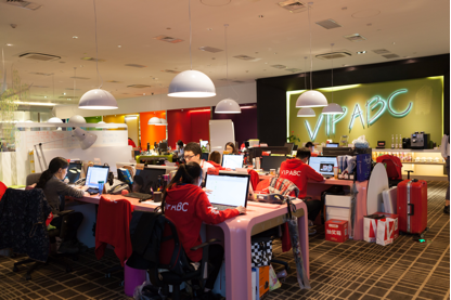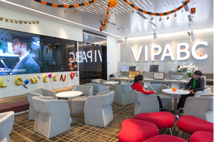 VIPABC访客会谈区,这里有很多椅子和沙发,公司人员与来访者在这个区域进行洽谈,大屏幕平时播放VIPABC宣传片,到了周五下午,这里则变成一个大型KTV,员工在这里举行各种庆祝活动。VIPABC每隔一周的周五下午均会举行员工团建活动,大家在轻松的氛围中交流、增进团队感情。