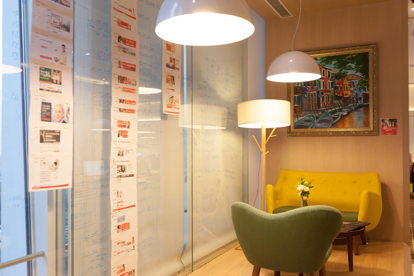 VIPABC随处都是可以写字的白板或者玻璃墙面,这样的设计是为了让同事在讨论的过程中可以直接把想法记录在白板上。从左侧的玻璃前面可以看出,这里刚刚进行过一次小型会议。