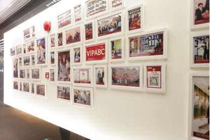 VIPABC公司文化墙,上面有员工团建活动、员工大会等活动的照片。