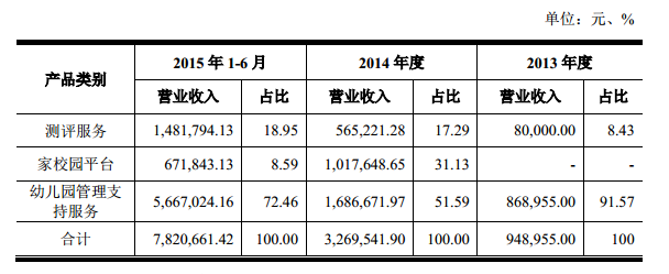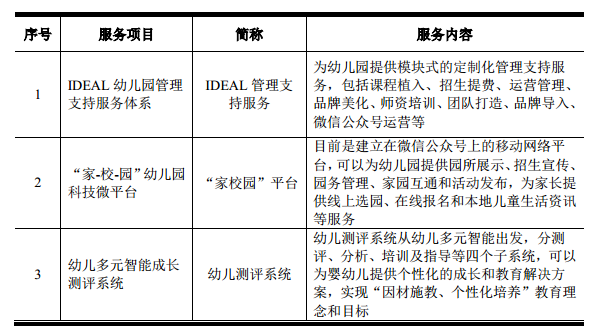 该公司目前的主要产品和服务包括IDEAL幼儿园管理支持服务体系、“家-校-园”幼儿园科技微平台及幼儿多元智能成长测评系统,其基本情况如下: