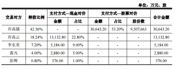 文化长城在公告中称,此次交易采用发行股份及支付现金方式,向许高镭、许高云、雷凡、李东英、彭辉、商融投资6名股东购买其持有的联汛教育80%股权,其中,40%的交易金额2.20亿元以现金方式支付,60%的交易金额3.46亿元以发行股份的方式支付。具体情况如下: