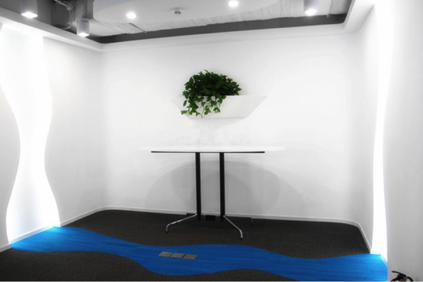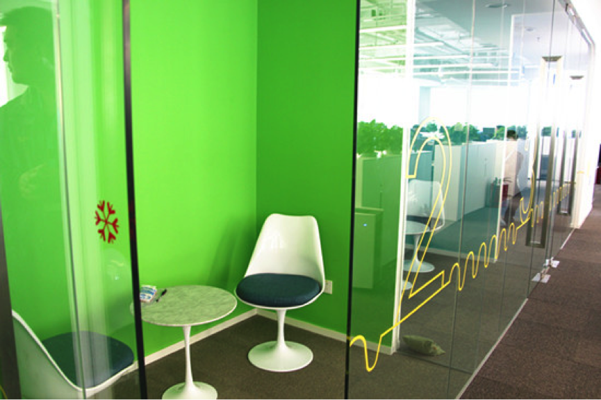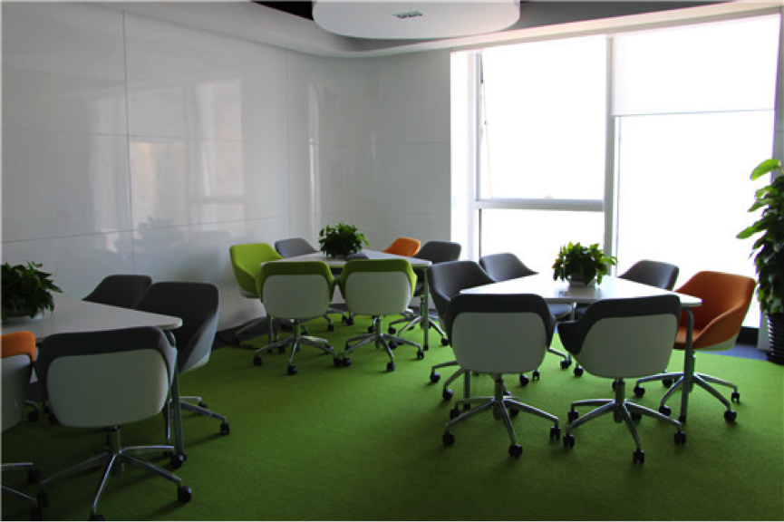 一进入主办公区,靠右的一侧设有一列玻璃间,墙面蓝色绿色为主,玻璃具有很好的隔音效果,市场部可以在里面谈业务,其他员工也可以在里面接打电话,既保护个人隐私不尴尬,又不妨碍其他员工工作,两全其美。