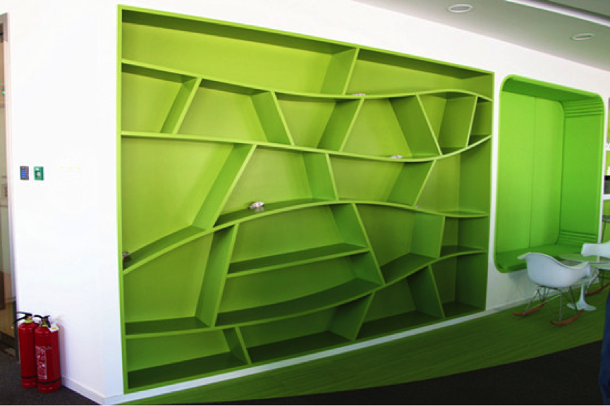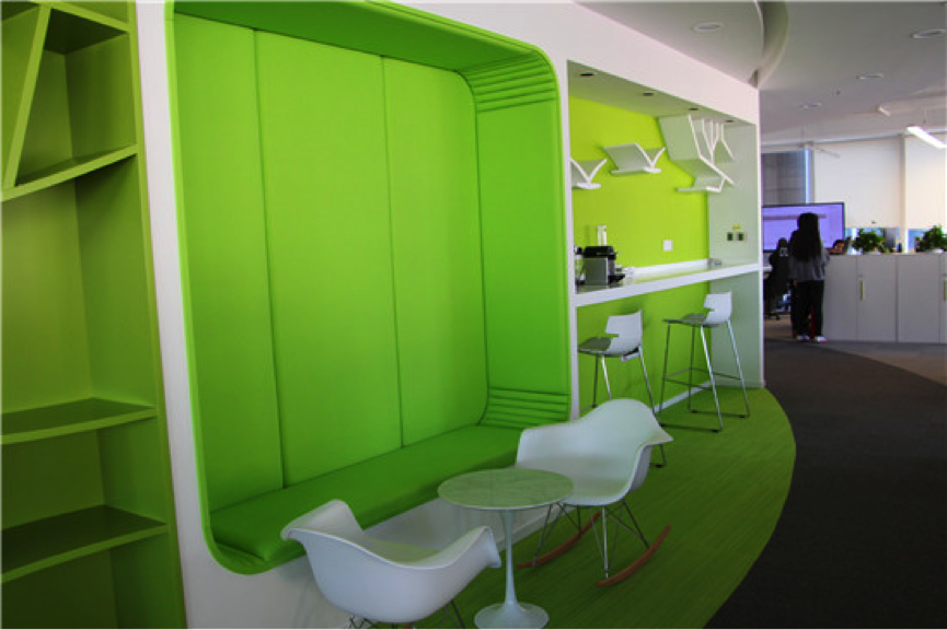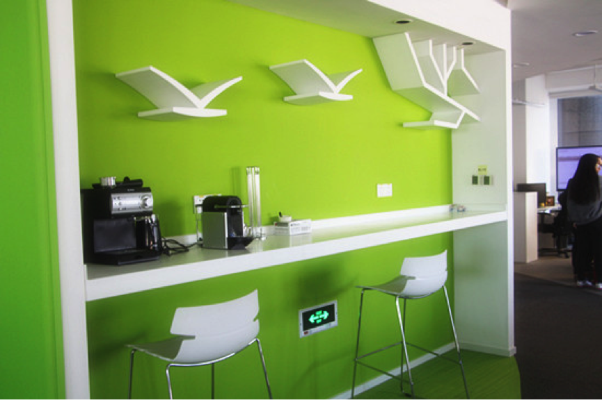 一起作业网6层的主题是“树”,因而以绿白为主色调,上图中的书架、休息区、咖啡区背景墙的颜色都是绿色,看上去赏心悦目,而且绿色有助于缓解视疲劳。在吧台上,有咖啡机和面包机,墙上精心放置小型书架,员工可以边看边吃。