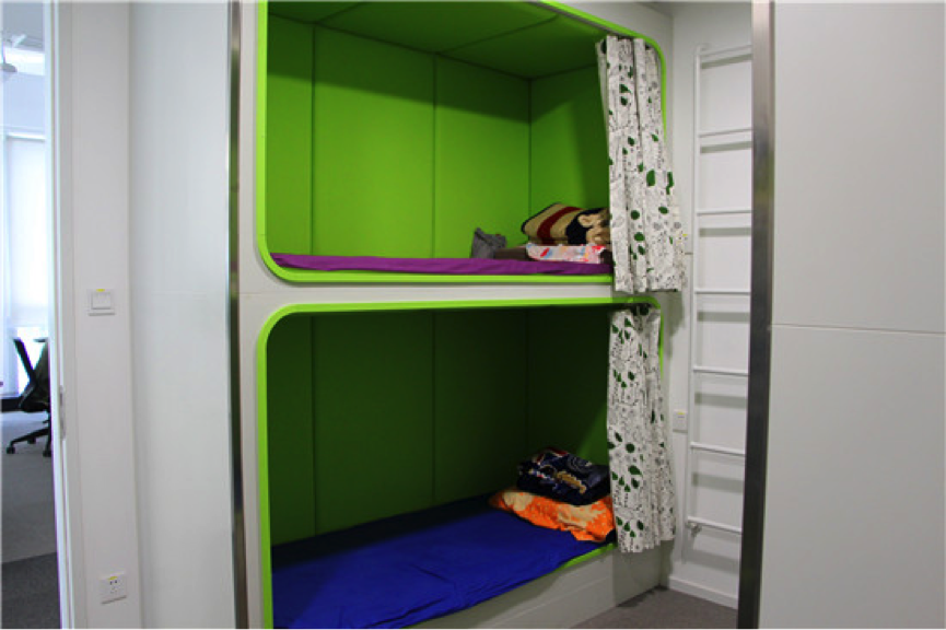据刘孟涛介绍,一起作业网为加班人员准备了休息室,命名为“太空舱”,里面包括四个床位,在另一侧的墙内嵌有衣柜,用于存放衣物,每张床上都有被子和毯子,柔软舒适。并且,清洁人员及时清理,为“微洁癖”的员工除去顾虑。