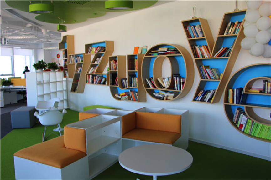 借阅区的书架造型为一起作业网的标志,别致有新意。书籍主要是公司购买、总裁推荐及员工捐赠。员工可以随意借阅,只需在行政部门登记,借阅的期限不定。