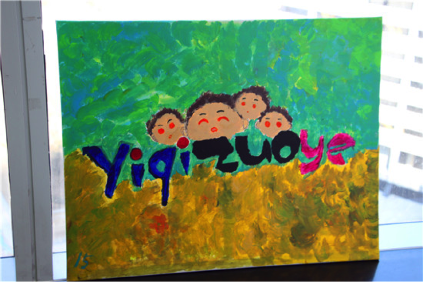 在靠窗位置,有很多绘画作品,一起作业网的工作人员介绍说,这些都是一起作业各地市场部的员工画的。这样的图片有很多,每个窗边都摆了一两张。