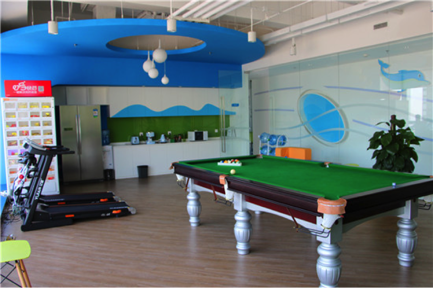 16层的饮水间和运动室结合在一起,命名为“地球”,包括台球、跑步机,以及咖啡机、冰箱、饮料贩卖机等,下午的时候,还会提供各种水果。