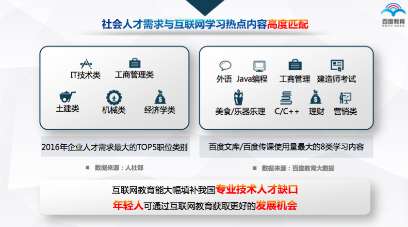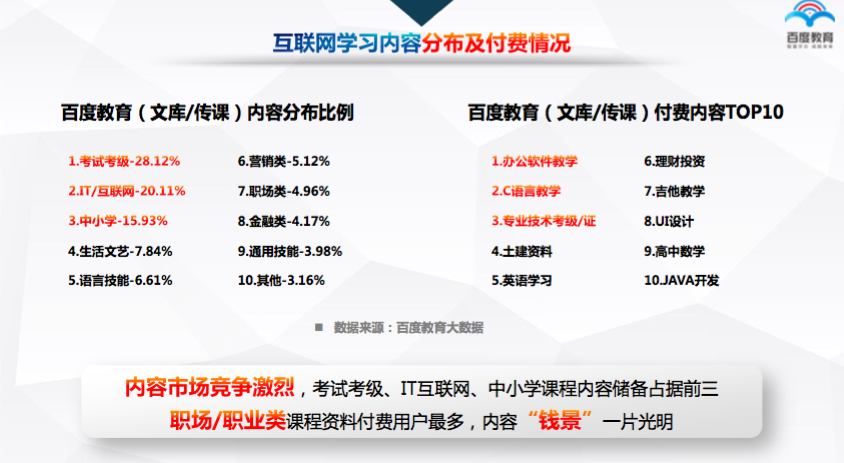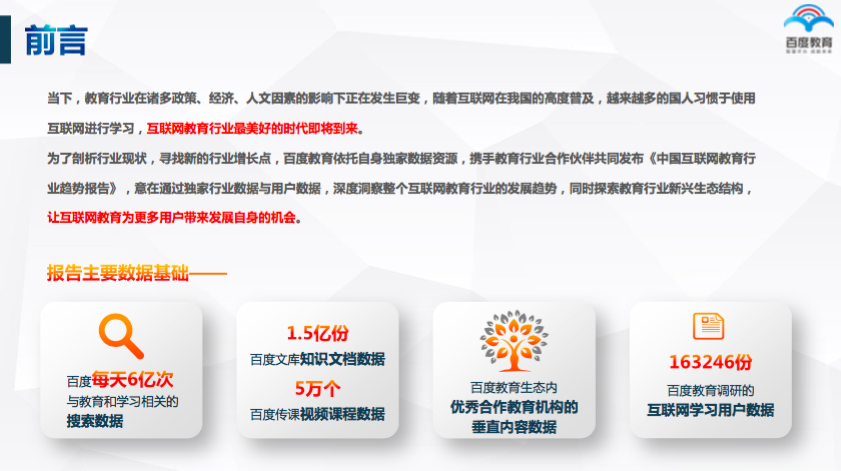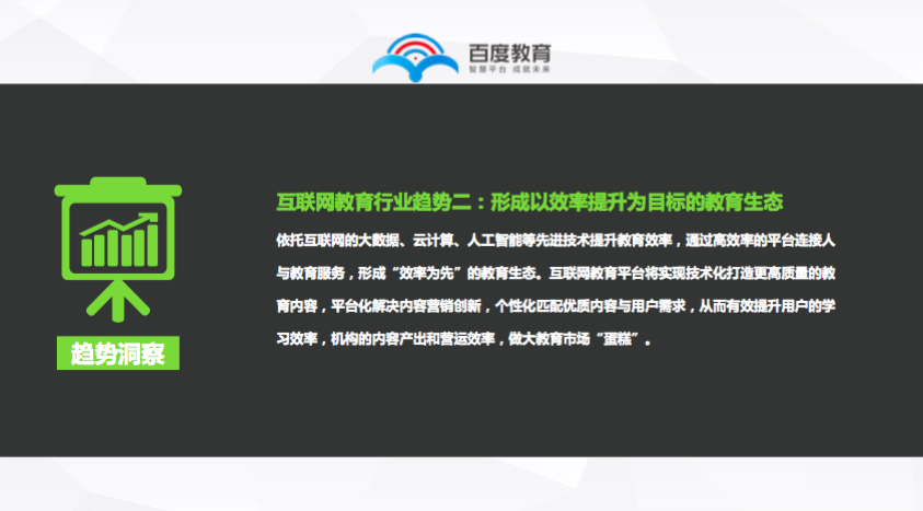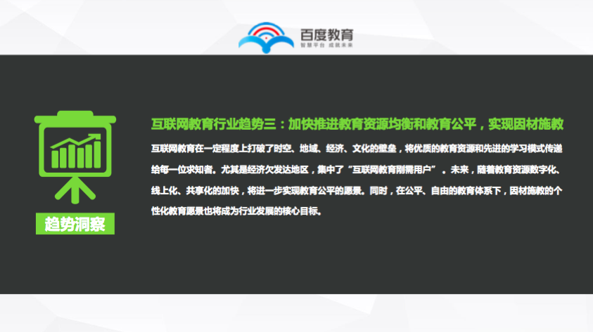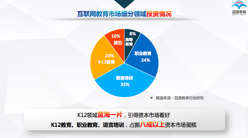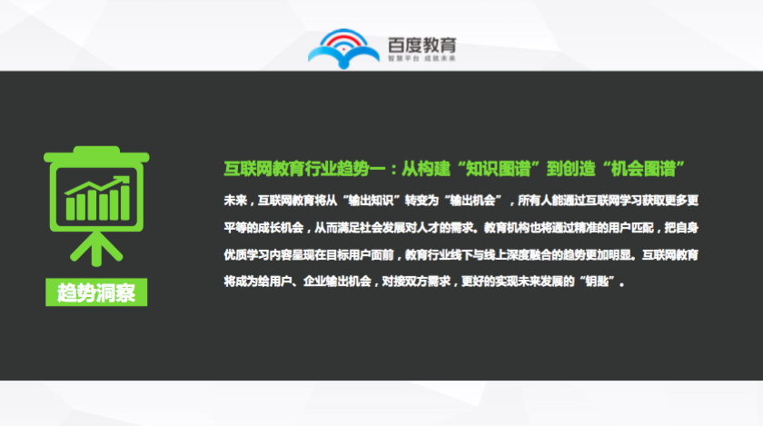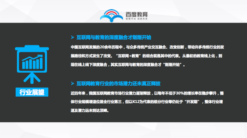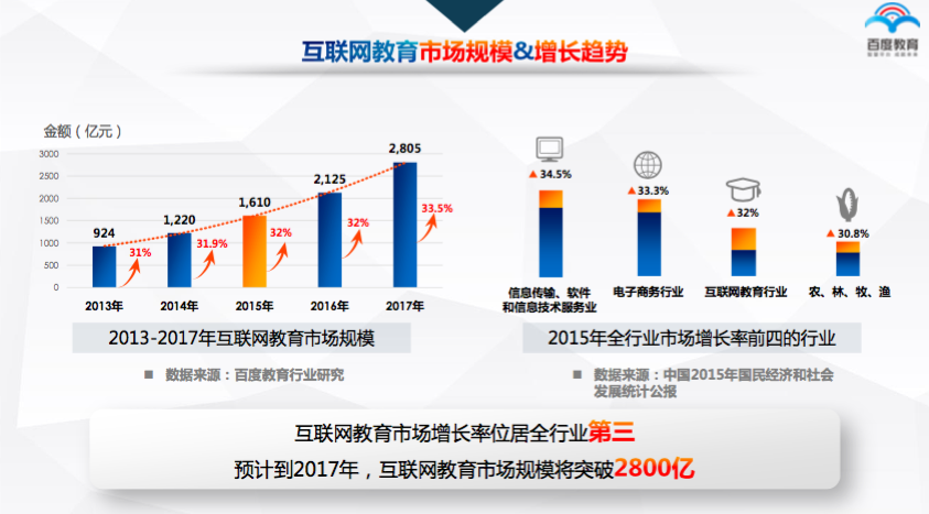百度报告显示:互联网教育市场增长率位居全行业第三,预计到2017年,互联网教育市场规模将突破2800亿元。