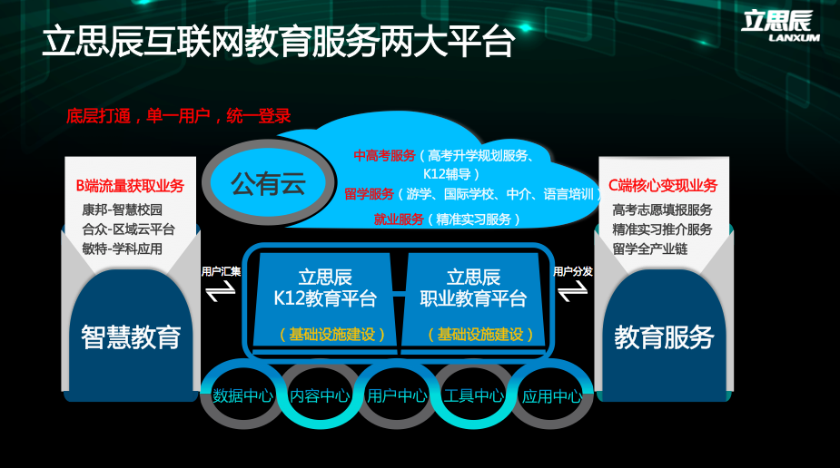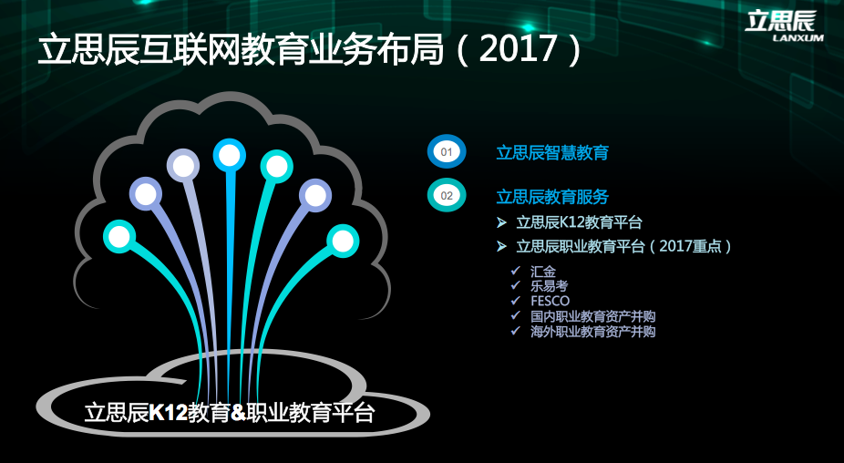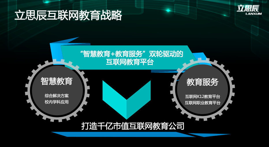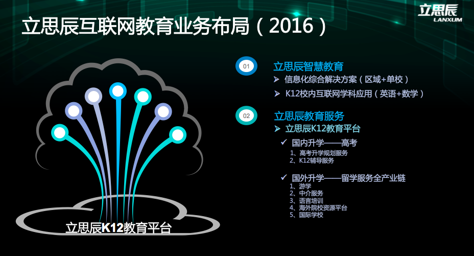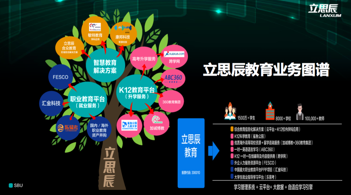 立思辰教育双核心组合“智慧教育、教育服务。智慧教育包含了合众教育、康邦科技、敏特教育,教育服务包括了k12领域和留学领域。通过投资,外延、内生的方式打造平台。