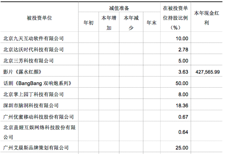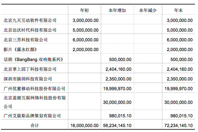 以1999万元投资了以移动广告投放+游戏代理联运为主要业务的广州优蜜移动科技股份有限公司,持股0.67%,该公司于2015年11月挂牌新三板;