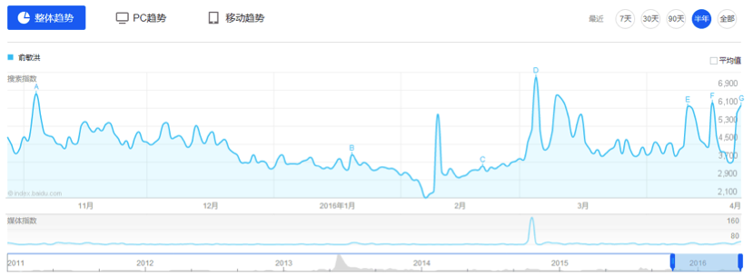 下图为“俞敏洪”搜索词百度指数近半年来的变化趋势: