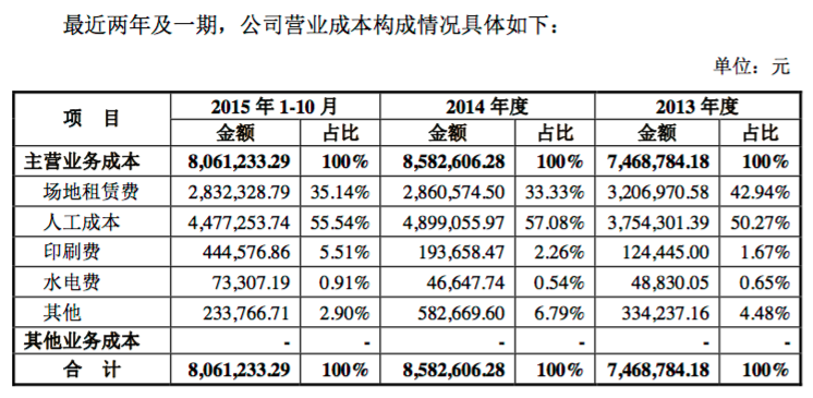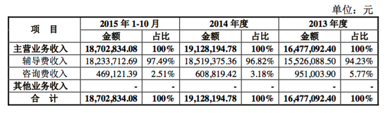 财报显示,泰祺教育2013年、2014年、2015年1-10月营业收入分别为1647.71万元、1912.82万元、1870.28万元;净利润分别为13.50万元、76.59万元、7.99万元。