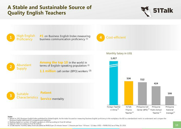 一个在中国的外教一个月薪水是1617美元,而51Talk的菲律宾外教的月薪只有536美元。