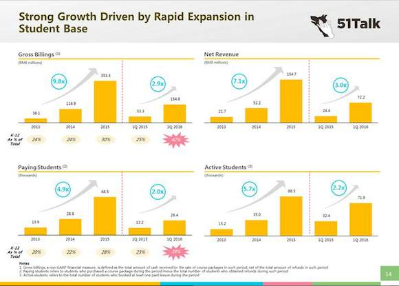 从左到右,从上到下,依次是毛收入、净营收、付费学生人数、活跃学生人数在2013到2015年间的增长情况。仔细看会发现,全部是向上的发展趋势。在横轴下面,51Talk采用了百分比的办法来记录具体数字,可以看出,其K12业务增长迅猛。