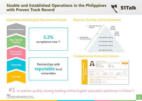 这一页主要在说老师的招聘,面试通过率为3.2%,并且51Talk和当地学校签订了协议,后者为51Talk提供稳定的师资来源。