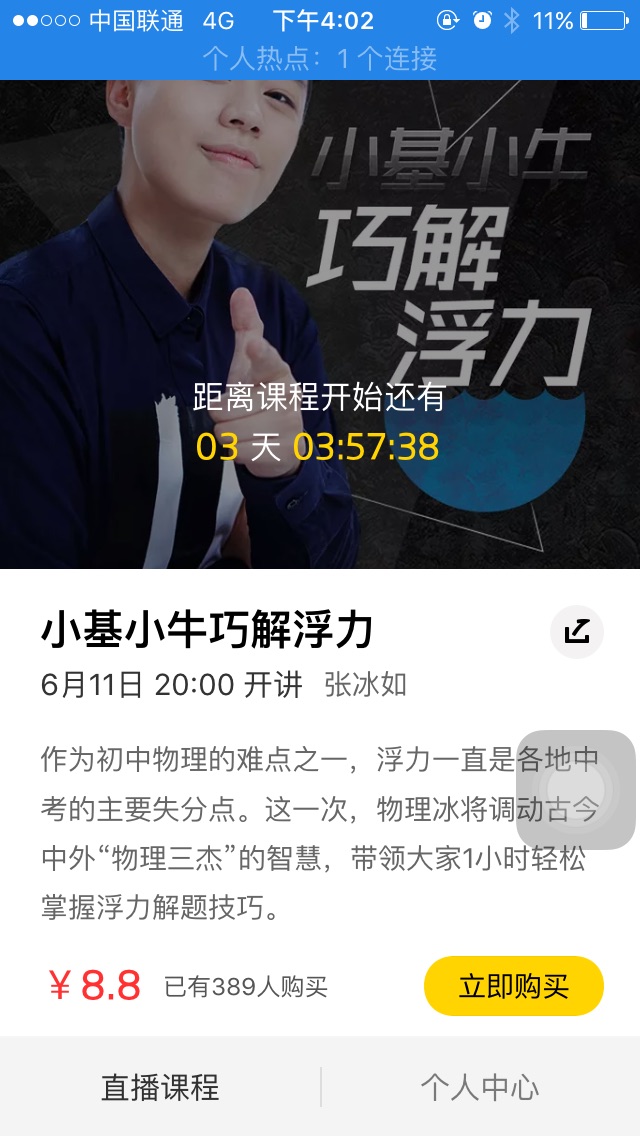 多知网进入叮当课堂APP发现,目前APP的界面还比较简单,目前分为直播课堂和个人中心两个菜单,直播课堂只有一个产品,即名为“小基小牛巧解浮力”,售价8.8元。