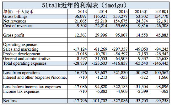 的确,2013-2015年,51Talk的净营收分别为2166万、5221万、1.55亿人民币,净亏损分别达到1780万元、1.117亿元、3.271亿,其中市场营销费用又分别高达1712万、8126万、2.97亿,虽然营收呈现高增长,但营收都不够市场营销开支,亏损严重。看了这样的业绩报表,对这家公司理论上已经没有多大的研究兴趣,但是后来看到公司的早期投资者DCM和红杉的2000万美元私募追加认购,不仅让我想起了2012年唯品会的“流血”上市(当时也是DCM和红杉保驾护航才成功IPO,后来成为大牛股),于是想花点时间看一看,而研究这个公司的聚焦点只有一个:这公司到底能不能赚钱?