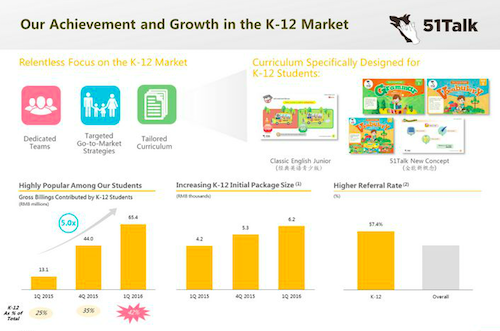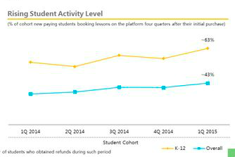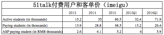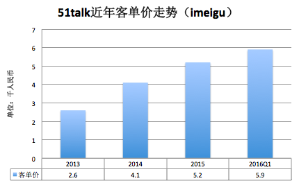 收入项( Gross billings):51Talk的课时费标准是30元人民币/25分钟,用户可购买次卡(最低套餐120次)或者包月卡(最低12个月起),根据公司最新的2016年Q1数据显示,该季度的学费收入是1.55亿人民币,付费用户数是2.64万,那么平均客单价即为5900元人民币。