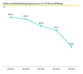 行政管理费用(类固定开支,用净营收占比反推单客费用):主要是497名行政管理人员的开支,2016年Q1报表显示该季度的行政管理费用/净营收是35.54%。反推均摊到每个付费用户,是2037块/学员,这块属于相对固定成本,相信随着招生规模和收入规模增加,生均费用会进一步下降。