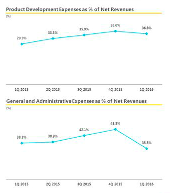 4、产品研发费用/当期净收入、行政管理费用/当期净收入在2015年的高企后,2016年Q1迎来下降拐点