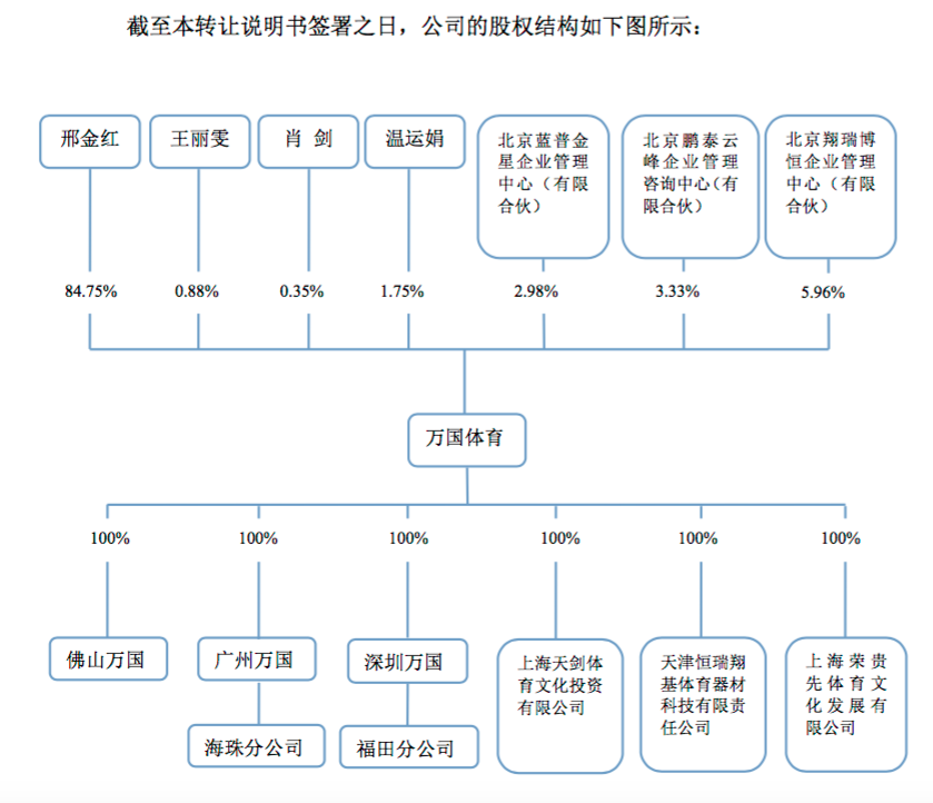 万国体育控股股东为邢金红。2015年10月至今,邢金红直接持有公司84.75%的股权,并通过翔瑞博恒、鹏泰云峰、 蓝普金星间接控制公司0.39%的股权。