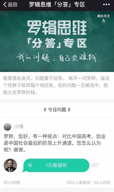 两周前,分答与罗辑思维试水合作,罗辑思维公众号接入分答功能,而分答帮助罗辑思维在公众号内部建立起专属问答社区。