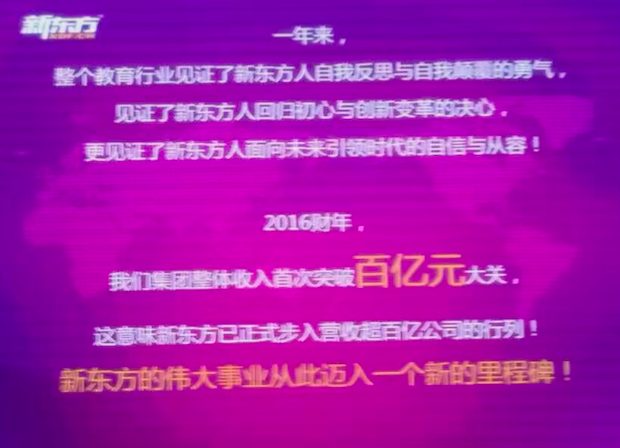 在今日的新东方2016财年总结表彰暨2017财年工作部署动员会上,新东方官方宣布,2016财年营收破百亿元。
