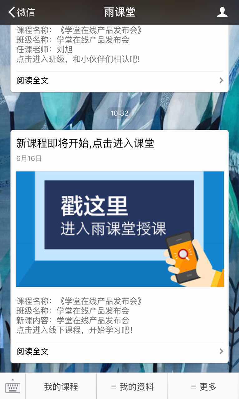 登陆雨课堂后,教师可以将带有MOOC视频、习题、语音的预习课件推送到学生手机,同时实现课堂上实时答题、弹幕互动。同时还可为师生提供数据支持、个性化报表、自动任务提醒等服务。