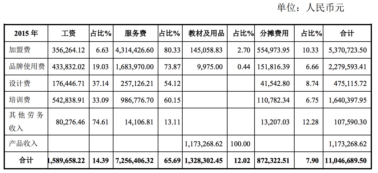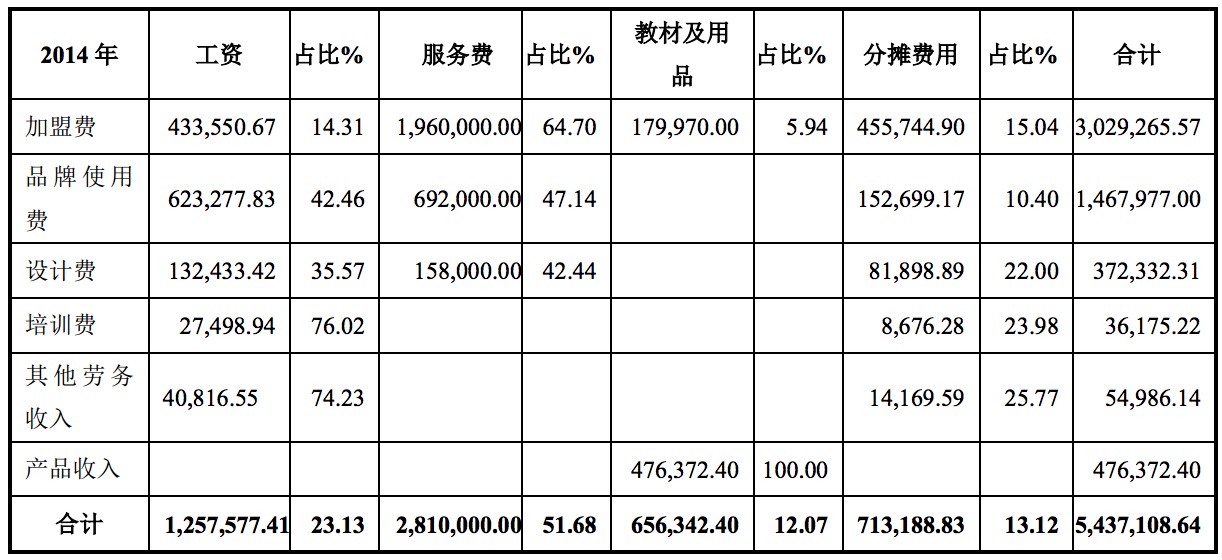公告显示,加盟费中,公司 2014 年度的工资和服务费占总营业成本的比例与 2015 年度持平,分别为79.01%和86.97%;其中外部机构的服务费占比 2014 年度与 2015年度分别为 64.70%和 80.33%。品牌使用费中,公司 2014 年度的工资和服务费占总营业成本的比例与 2015 年度持平,分别为 89.60%和 92.90%,其中外部机构的服务费占比 2014 年度与 2015 年度分别为 47.14%和 73.87%。