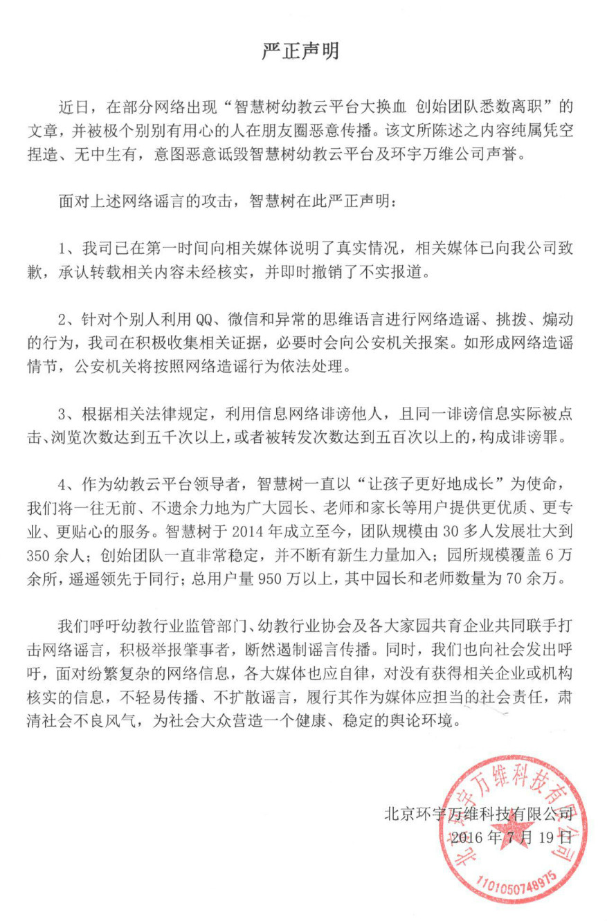 “和晶投资智趣(互联)看来真把竞争对手惹急了,通篇造谣诋毁智慧树。智慧树压根就没有过产品VP、CTO、CMO职位,至于什么亏损,那是战略布局,前三年智慧树从来没考虑盈利,目前家园互动行业无一公司盈利!国内任何第三方统计平台统计的用户活跃数智慧树遥遥领先竞争对手,也请友商拿出实力出来,在市场上正面竞争,不要如此低劣。一个操守低下的公司从事教育事业真是一种悲哀!”