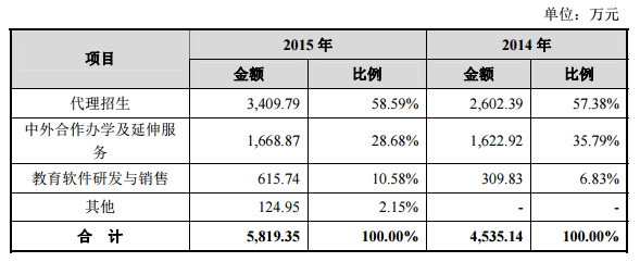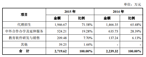 表中,2015年,代理招生为1946.67万元,占比71.58%;中外合作办学及延伸服务为524.21万元,占比19.28%;教育软件研发与销售209.48万元,占比7.70%。