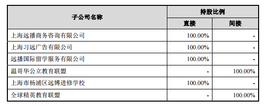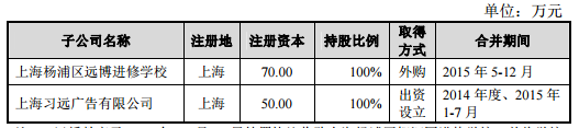 据悉,远播教育于 2014 年 10 月 27 日签署协议收购上海杨浦区智汇园进修学校,并将学校 更名为上海杨浦区远博进修学校。上海习远广告有限公司成立于 2009 年 9 月 25 日,由远播教育 100%控股。2015 年 7 月 20 日,全资子公司上海习远广告有限公司完成工商注销,因此不再将其纳入合并财务报 表范围。