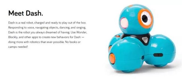 Dash和Dot是分别为两种类型的机器人,Dash售价149.9美元,Dot价格为49.9美元。其中,Dash混合着红外线、速度、重力等多种传感器,拥有若干交互功能。它个头大,可以唱歌、跳舞和移动,与孩子进行自然语言的问答。小一点的Dot则是机器人的信息处理中枢,也具有闹钟、夜灯等功能。孩子可以通过在平板上用APP进行图像化编程,操纵机器人完成各种复杂动作,比如规划机器人的行进路线,弹琴和弹球。