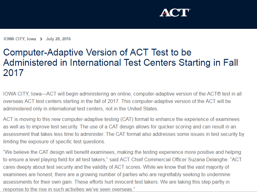 多知网7月29日消息,昨日,IOWA CITY,Iowa在官网上发布报道称:全球ACT考试中心将于2017年秋季开始启用在线机考版本测试。此机考版本ACT测试将只在国际考试中心实施,并不包括美国本土。