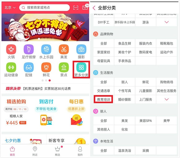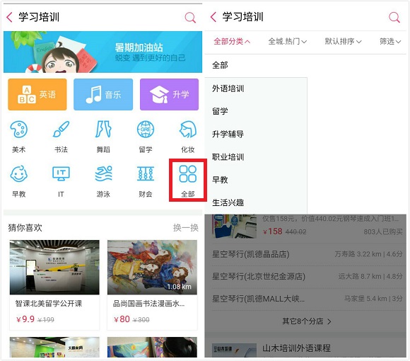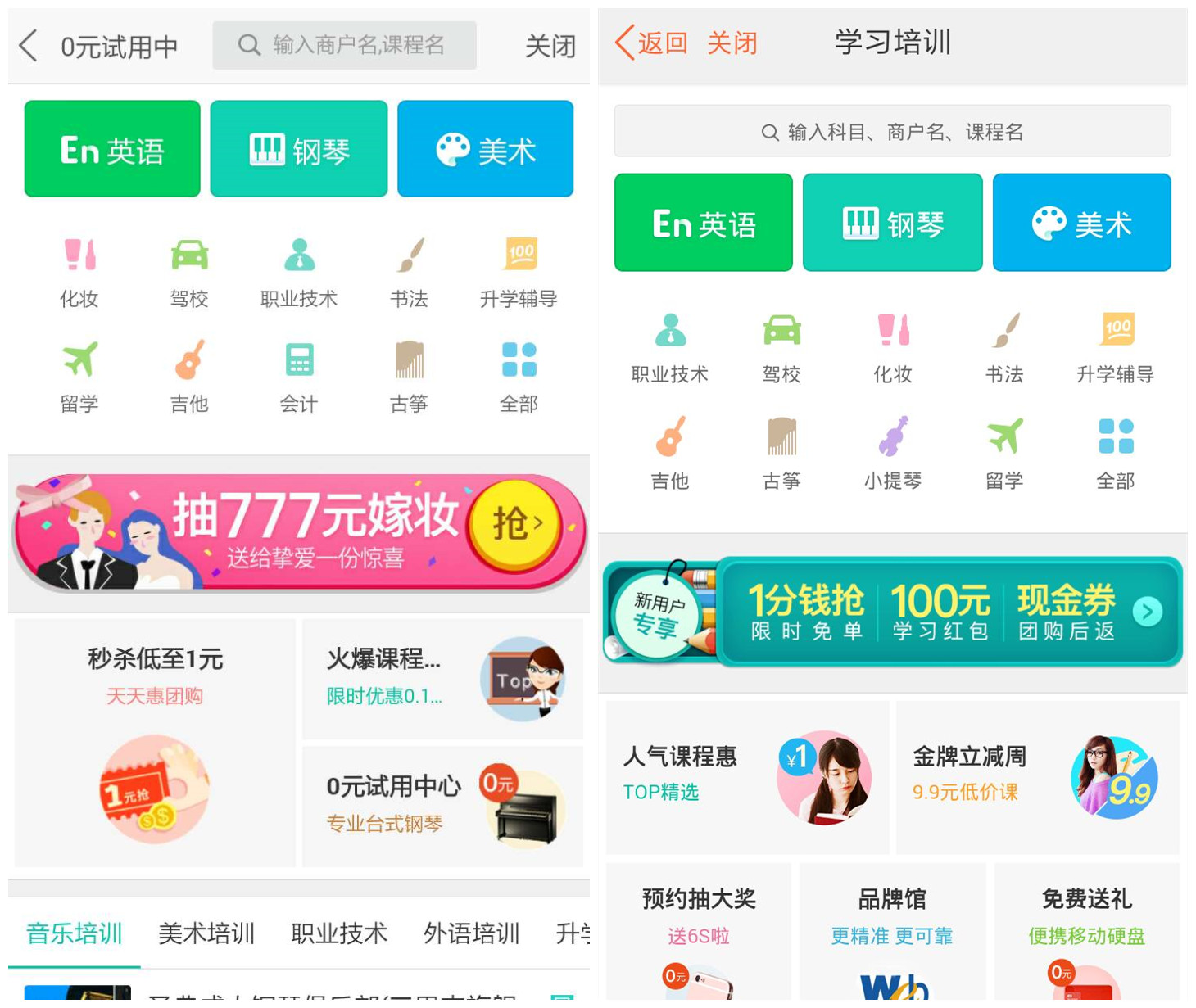 (左图为美团“学习培训”界面,右图为大众点评“学习培训”界面)