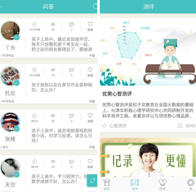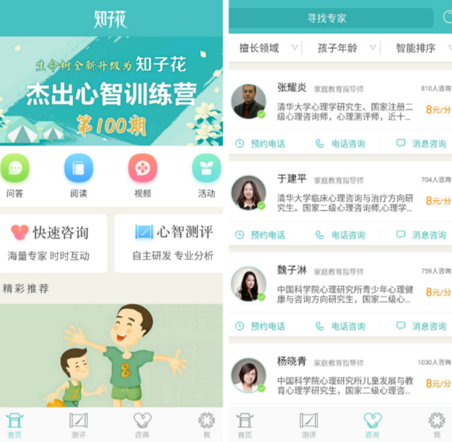 家长可以在知子花APP的问答专区提问,知子花咨询师会根据家长的问题给予解答,家长若有更多问题,可以选择知子花平台的咨询师进行电话或消息咨询,电话咨询收费为4-10元/分钟。据了解,知子花与咨询师的分成比例为50%。