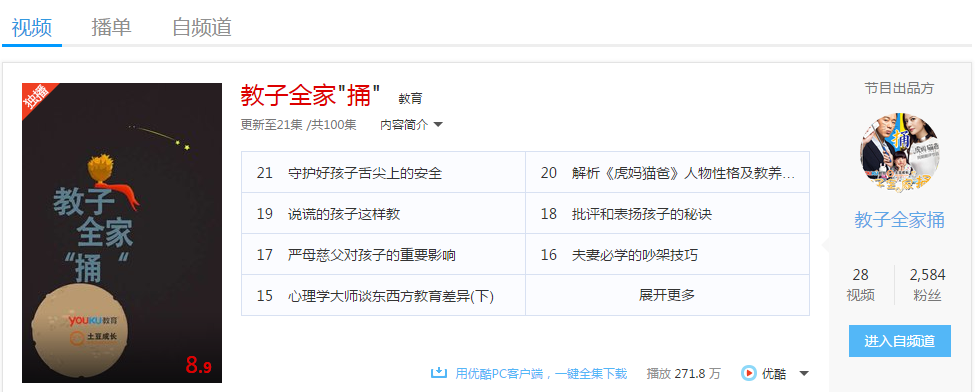 另一方面,知子花与优酷合作,制作了家庭心理教育栏目“虎妈猫爸”,该栏目在优酷平台上叫做“教子全家‘捅’”。据透露,该栏目目前总播放量300多万。