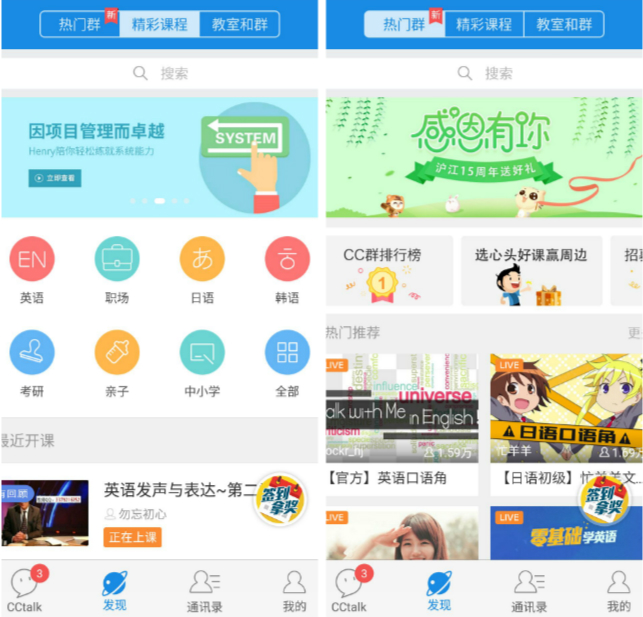 2014年8月13日,沪江网在安卓平台发布了移动直播课堂“CCtalk”。CCtalk是一款在线直播的学习产品,定位开放平台,官方称,目前有数百家教育机构入驻并提供直播教学内容。
