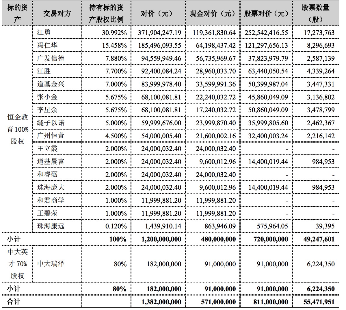 公告披露,本次购买资产交易价格 13.82亿元,其中现金对价 5.71万元,股票对价8.11万元。按每名交易对方将获得的股票对价及发行价格折算,本次购买资产交易合计发行股份 55471951 股,具体情况如下: