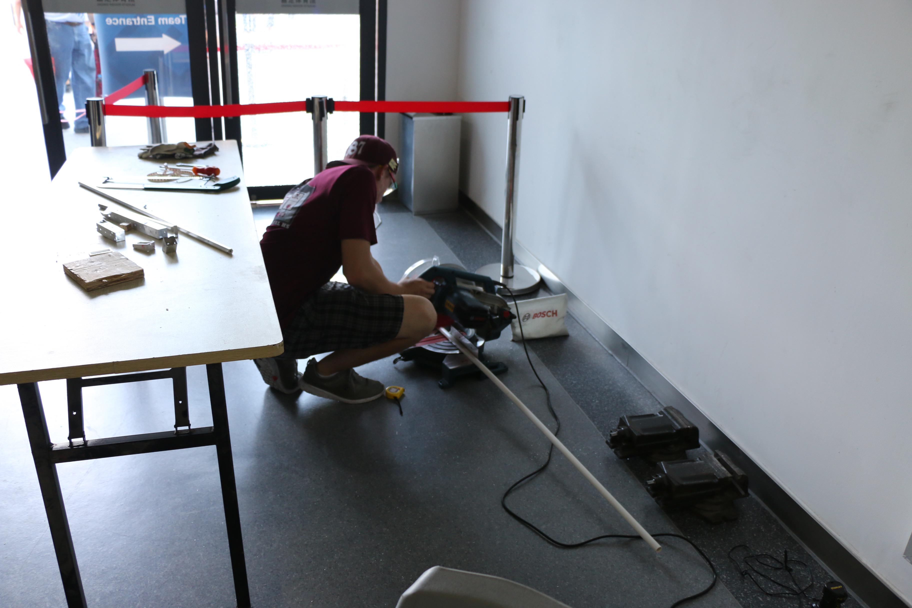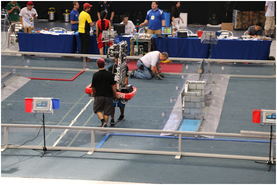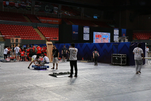 当机器人进场时一般用推车推着,等到上场比赛时是2-4人抬进赛场。