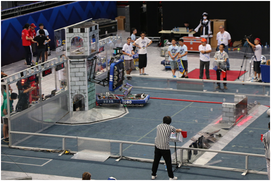 图中,一场比赛快结束时,一个蓝色的机器人爬上了高塔。另外两辆,其中一个在底端靠近了高塔,另外一个则没能靠近。