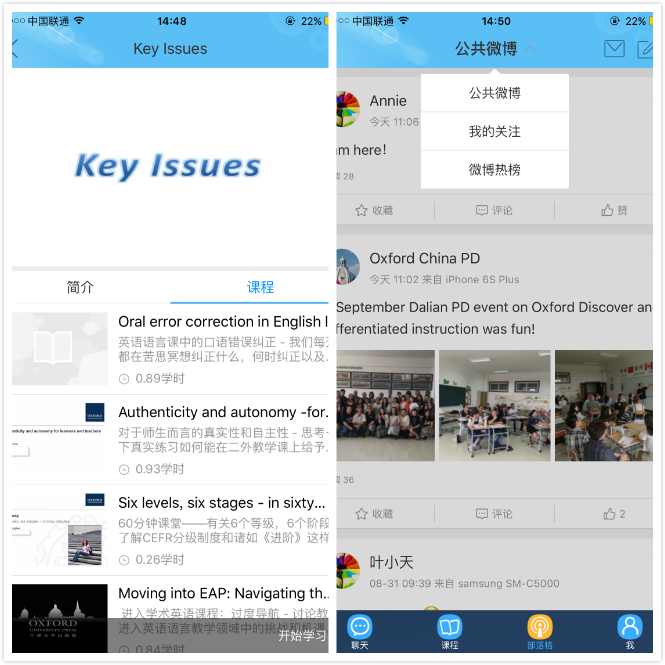 “牛津师道”APP页面包括聊天、课程、部落格等,主要是提供给教师使用,教师可获取和学习牛津大学出版社提供的教师发展课程及教材配套的教学视频资源。