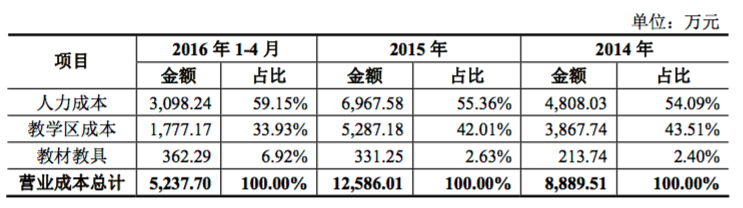 营业成本方面,高思教育营业成本构成主要包括教师课酬、人员工资、奖金等人力成本,房屋租赁费及装修费用等教学区成本以及购买教材教具的费用。具体成本构成如下: